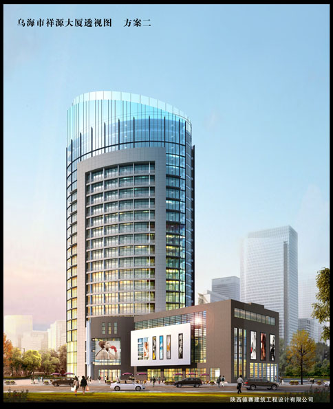 祥源大廈位于內(nèi)蒙古烏海市,由于烏海位于沙漠邊緣,基本沒有農(nóng)業(yè)產(chǎn)業(yè),是一個(gè)礦產(chǎn)及工業(yè)性的城市,為了打破城市原有的、單一的城市風(fēng)貌,平面布局設(shè)計(jì)為一個(gè)橢圓形的塔樓,并在立面設(shè)計(jì)時(shí)采用大面積的玻璃幕墻,最大限度的采光并提升城市品味。